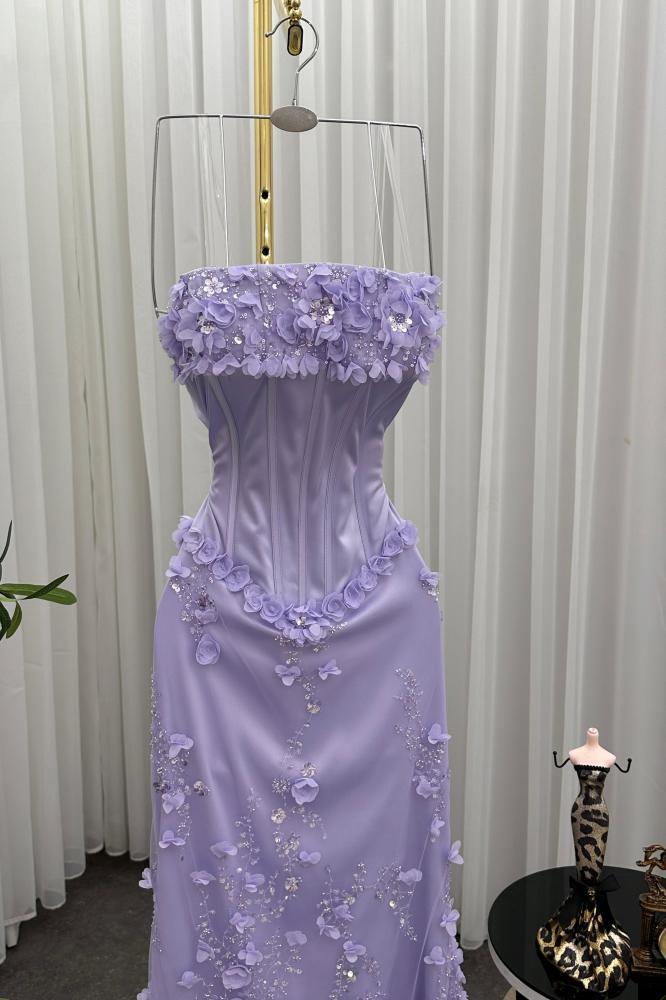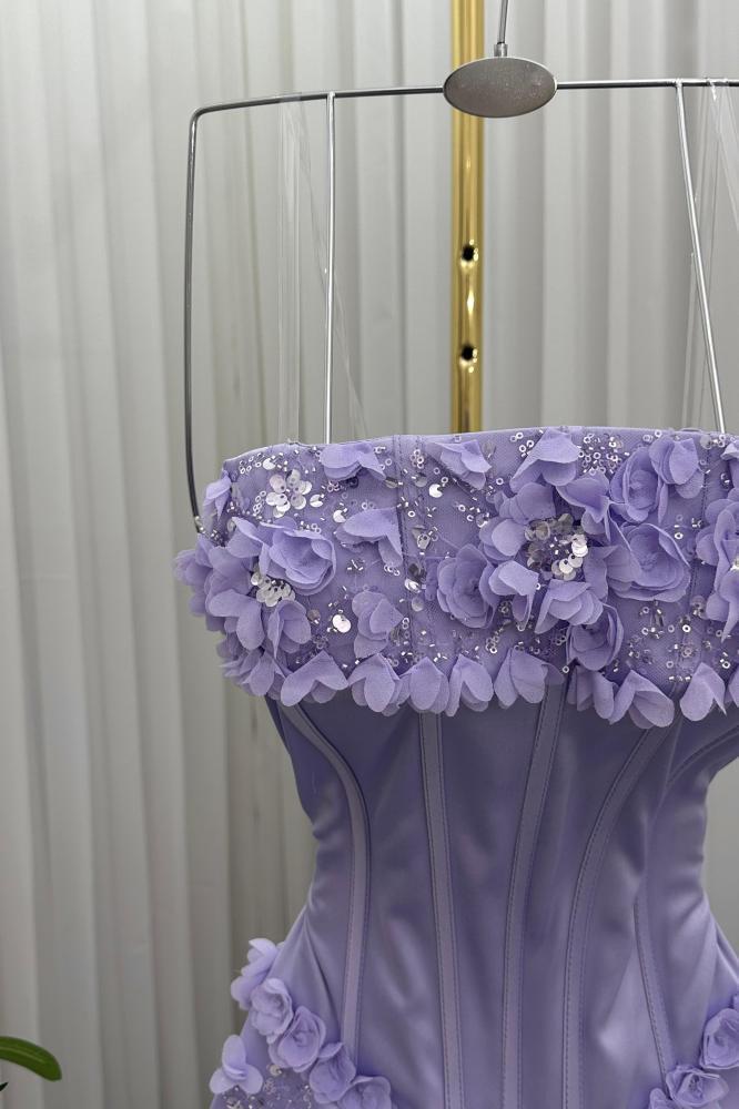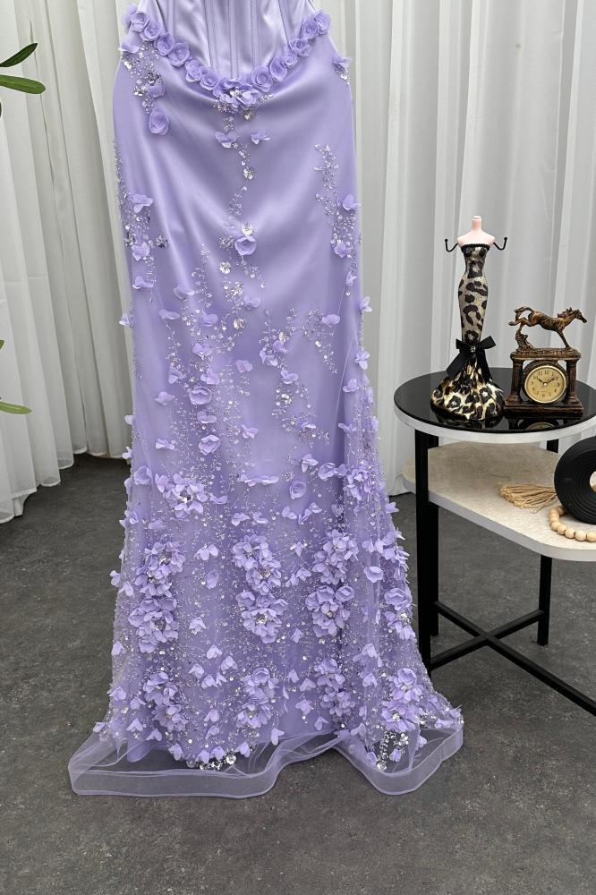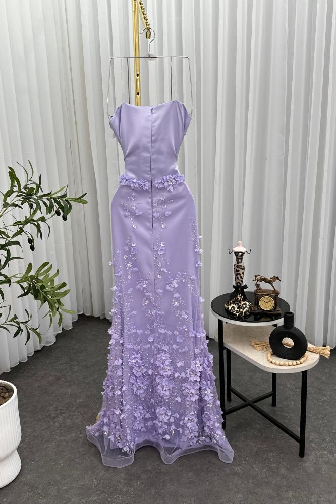 تألقي كأميرة في أمسيتك الخاصة مع هذا الفستان الموف الفاتح المصمم ليخطف الأنظار. يتميز بقصة سترابلس أنيقة وبطانة كورسية تبرز جمال القوام، بينما تنساب طبقات التل المطرز والشيفون برقة على الأرض، مزينة بتطريزات زهرية فاخرة تضيف لمسة من الرقي والأنوثة. هذا الفستان ليس مجرد قطعة ملابس، بل هو تجربة ساحرة تعكس ذوقك الرفيع.